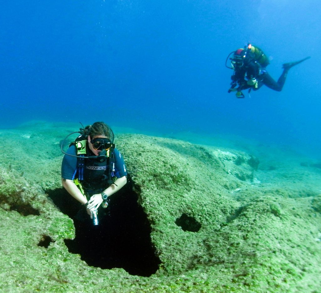 Amphitrite cave has been explored down to the bottom, which is at 60 metres. When visiting this site, we obviously don’t go down so deep, but enter through one of the entrance/exits and stop at a sandy bottom at 14 metres. From here you are able to shine a torch down into the cave itself and see the stalactites and some of the columns that are down there. Once we exit from there, the remainder of the dive is along a wall. Where we usually see plenty of fish and normally at least one Synaptula Reciprocans (a long worm sea cucumber).